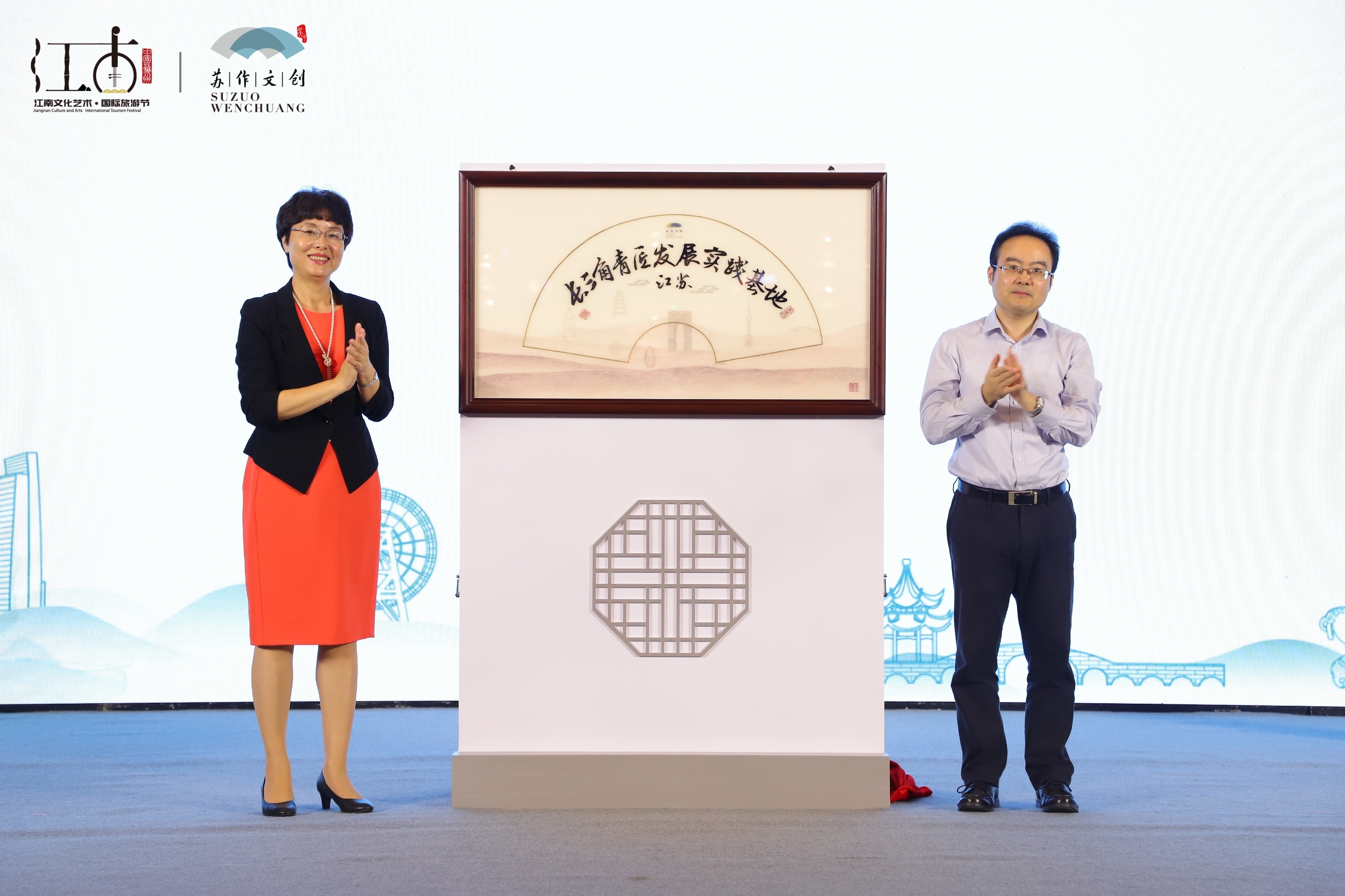 吴中区委副书记、区政府区长陈嵘和江苏团省委副书记潘文卿为全省首个长三角青匠发展基地揭牌。