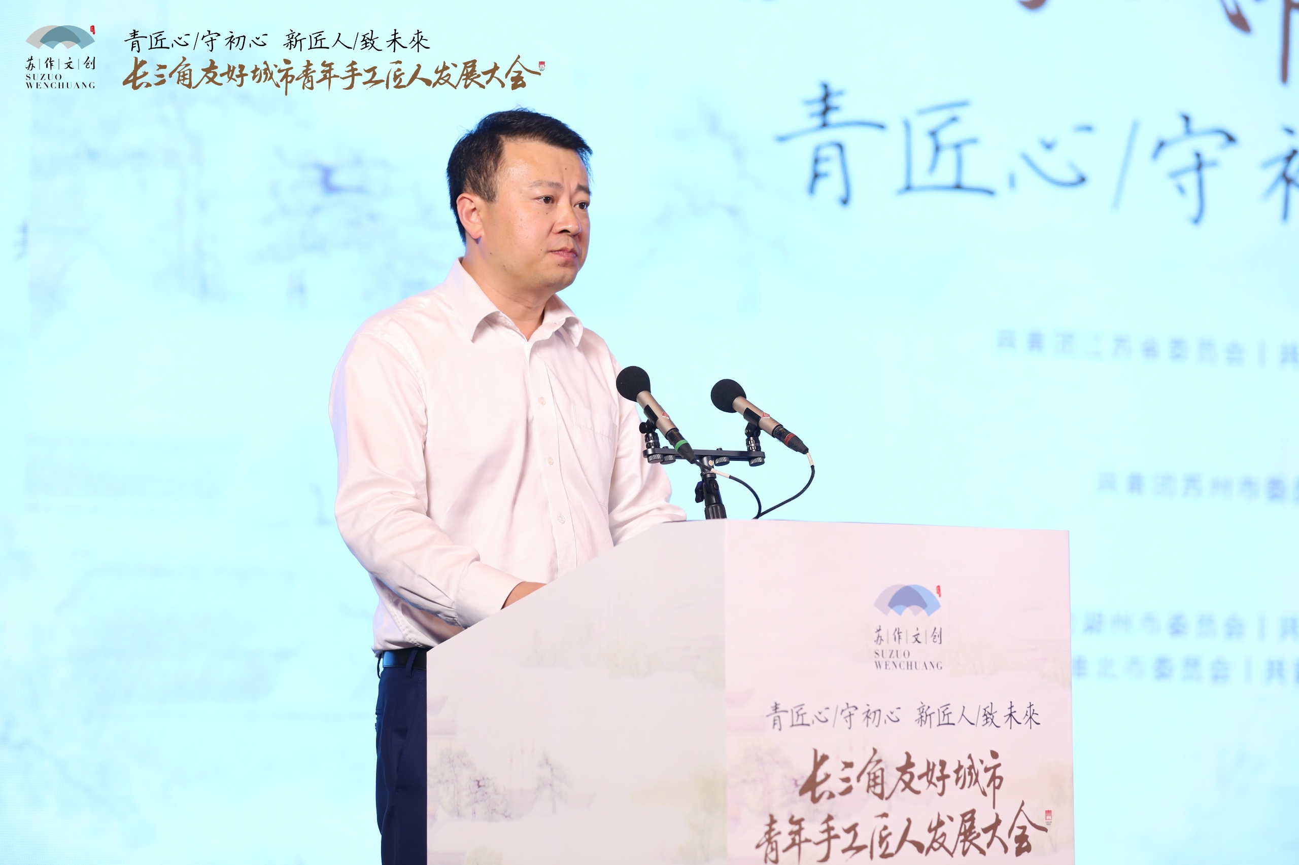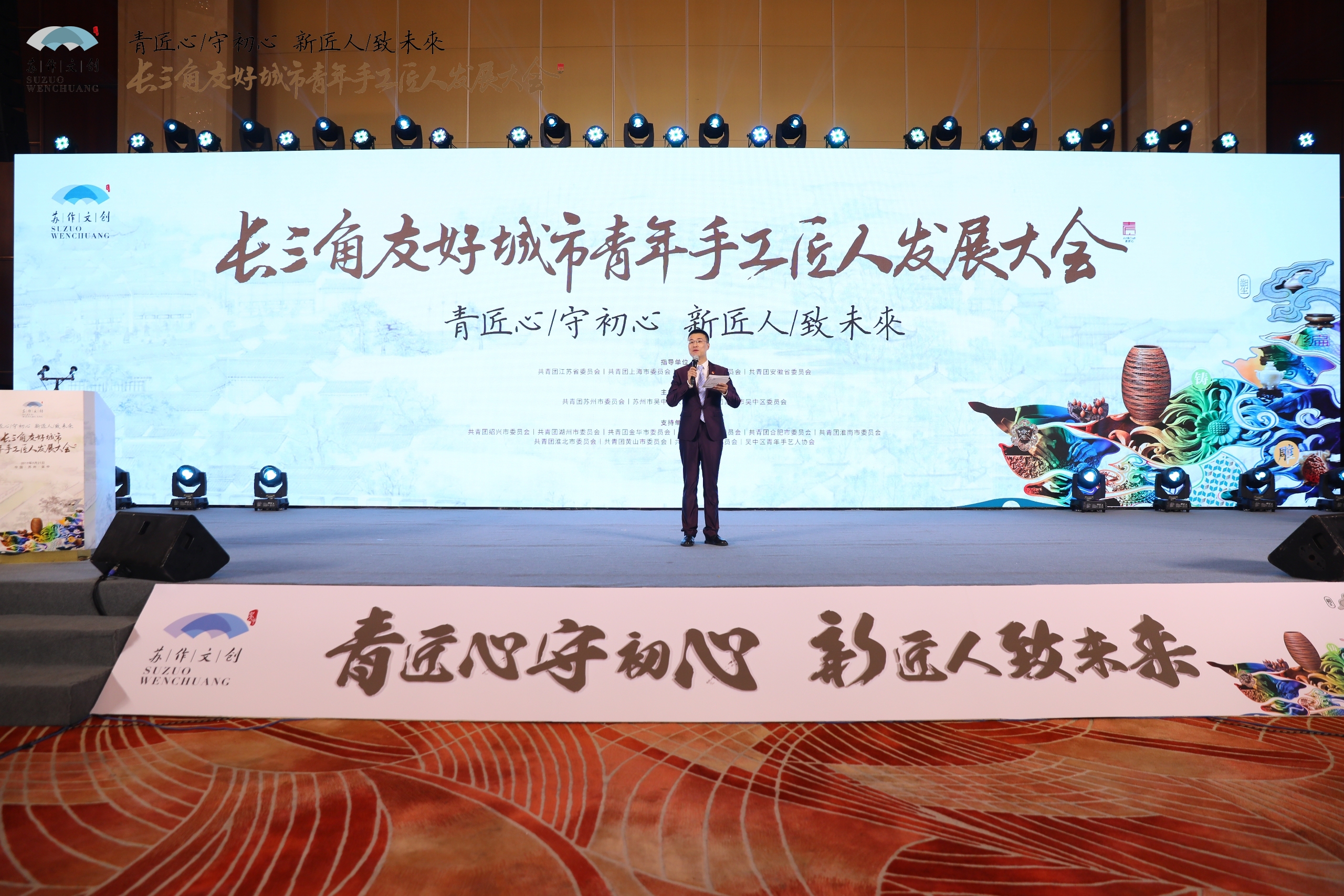 江苏团省委副书记潘文卿致辞,他指出,青年工匠精神是一种坚守、一种创新、一种务实,希望在各位业界专家学者的鼎力支持下,在苏州率先发起和先行实践下,长三角青年手工匠人能够更加密切交流与合作,借力苏作文创峰会,形成长三角传统文化产业和手工技艺行业共同发展的良好局面。