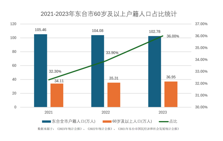 中国已进入“深度老龄化”,东台市老龄化问题更严峻。2023年末,我国60岁及以上人口为29697万人,占21.1%,其中65岁及以上人口为21676万人,占15.4%。[1]将视野转向地方,以东台市为例,这一全国趋势在地方层面的表现同样显著。2021年末,东台全市户籍人口105.46万人,60岁及以上人口34.11万人,占32.3%。2022年末,东台市全市户籍人口104.08万人,60岁及以上人口35.31万人,占33.9%。2023年末,东台全市户籍人口102.78万人,60岁及以上人口36.95万人,占36.0%。[2]横向比较,近三年东台市60岁及以上人口占比逐步攀升。2023年,东台市60岁及以上人口占比高于全国水平14.9%。