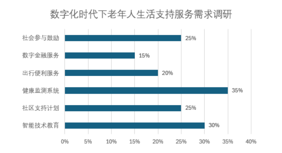 龄、失能和贫困老人的基本生活保障,也包括帮助智力健全、身体健康、经济独立的老年人掌握现代科技,提高他们的生活质量。通过数字化时代下老年人生活支持服务需求调研,我们发现健康监测系统的需求最高,占比35%;其次是智能技术教育,占比30%;社区支持计划和社会参与鼓励各占25%;出行便利服务占20%;而数字金融服务的需求最低,仅占15%。