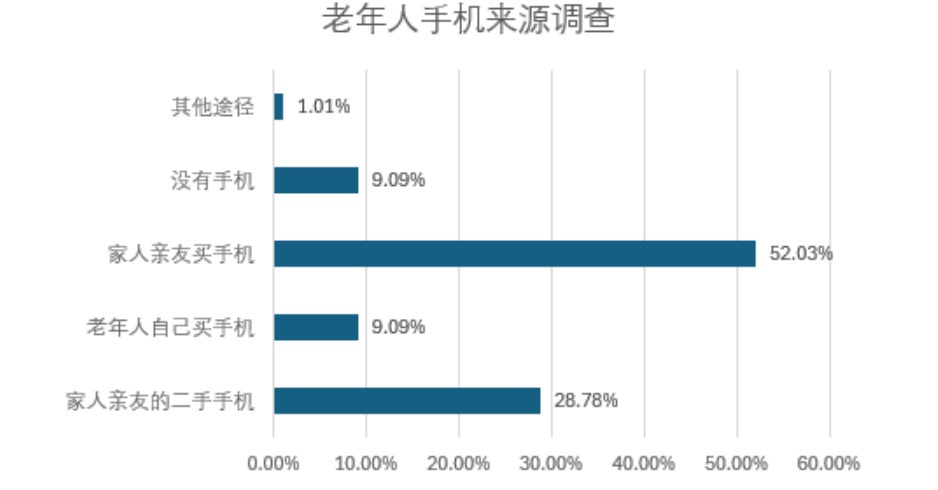 数据显示,家人亲友为老年人购买手机占比最高,达到52.03%,成为最主要的手机来源。紧随其后的是从家人亲友处获取的二手手机,占比28.78%。老年人自己购买手机的比例较低,为9.09%,与没有手机的老年人比例相近,后者同样占9.09%。而通过其他途径获得手机的老年人最少,仅占1.01%。图表清晰直观地揭示了老年人获取手机的主要途径及其分布情况。