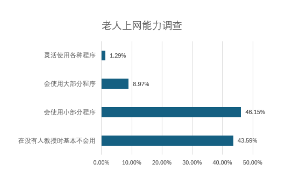图中数据显示,仅有1.29%的老人能够灵活使用各种程序,8.97%的老人会使用大部分程序,而46.15%的老人仅会使用小部分程序。值得注意的是,高达43.59%的老人在没有人教授的情况下基本不会使用网络程序。这些数据清晰地反映了老年人在网络使用能力上的现状,表明大部分老年人在网络应用方面存在较大的挑战。