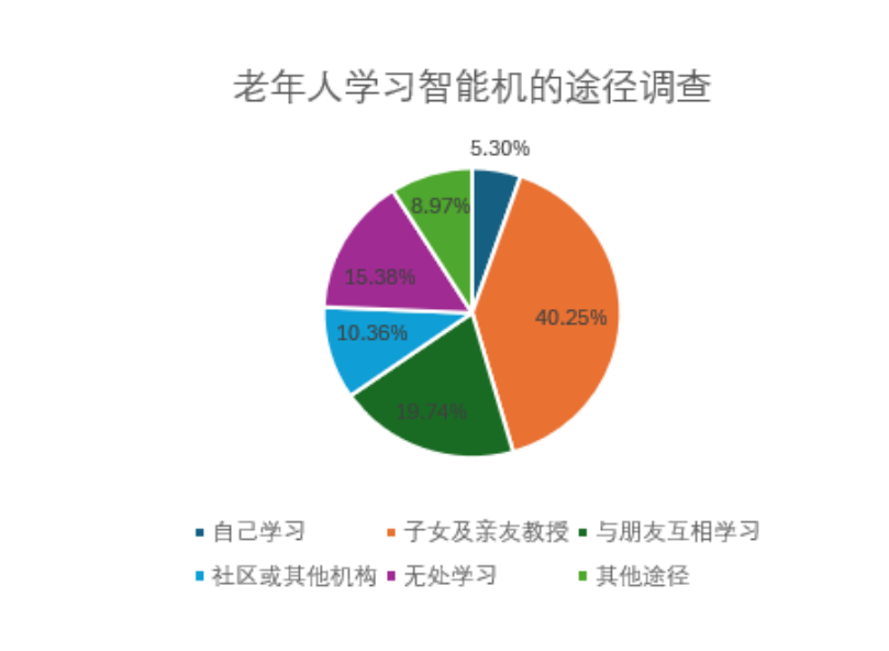 数据显示,最主要的学习方式是“与朋友互相学习”,占比高达40.25%。紧随其后的是“子女及亲友教授”,占比19.74%。选择“社区或其他机构”学习的老年人占15.38%,而选择“自己学习”的仅占5.30%。另外,有8.97%的老年人表示“无处学习”,而剩余10.36%的老年人则通过“其他途径”学习智能机。整体来看,老年人学习智能机的方式多样,其中与朋友互相学习和依赖家庭支持是较为突出的两种方式。