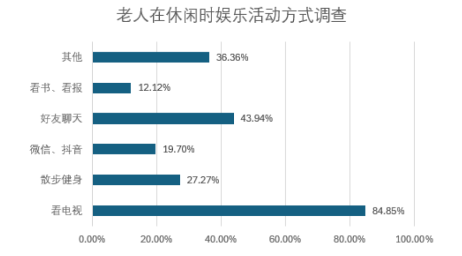 数据显示,看电视是老年人最热衷的活动,占比高达84.85%。紧随其后的是与好友聊天,占比43.94%。散步健身也颇受欢迎,占比27.27%。相比之下,看书、看报以及使用微信、抖音等活动的参与度较低,分别占12.12%和19.70%。此外,还有36.36%的老人选择了其他休闲方式。整体而言,老年人在休闲时更倾向于传统的娱乐活动,如看电视和社交聊天。