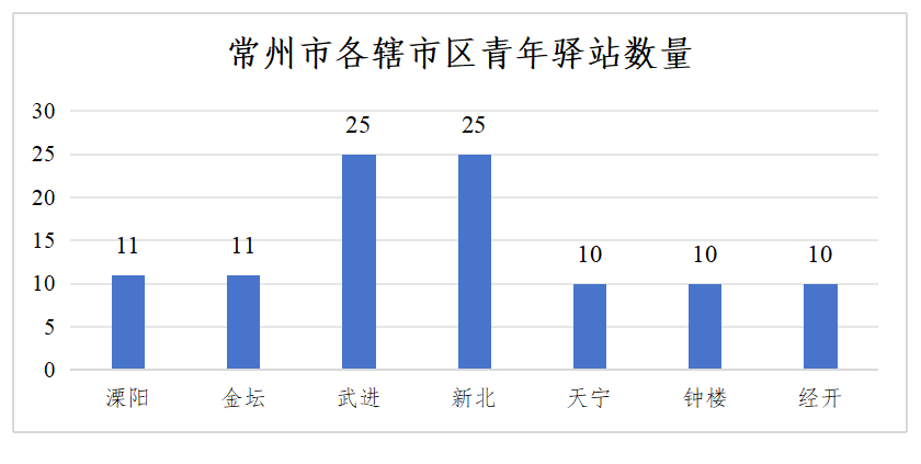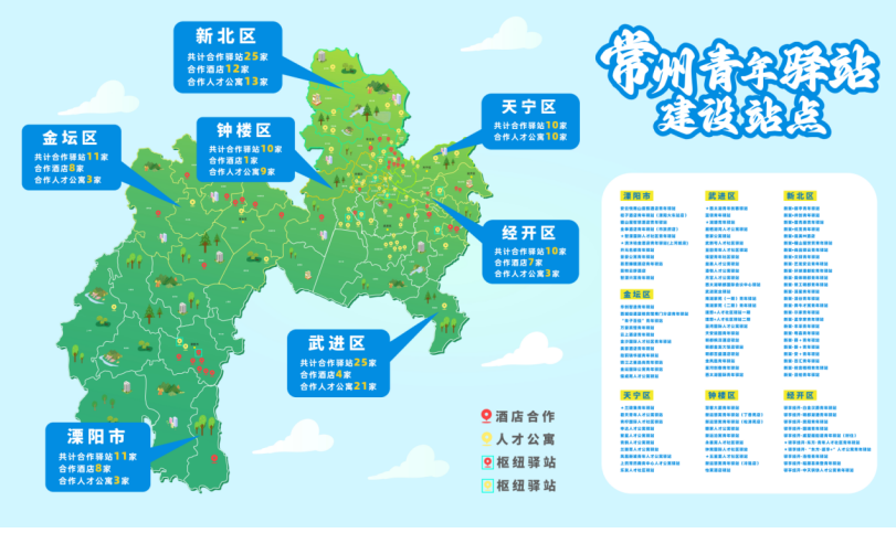 (二)耦合空间,打造青春留常的“温馨前哨站”。青年驿站是全团服务青年的品牌项目,常州团市委坚持“立足产业布局、紧跟人才公寓”的思路,一体化推进人才公寓、青年驿站布局建设,不断优化驿站宣传、引才、服务功能,将青年驿站作为来常青年走进常州、了解常州、留在常州的“前置窗口”,青年驿站工作得到市委市政府的高度认可,市政府主要领导率队调研青年驿站建设。一是场景耦合,合理布局。制定出台《常州市青年驿站建设标准》,在全省率先将“青年驿站建设”纳入市政府民生实事项目,努力推动青年驿站与人才公寓共建共享,在全市建成核心商圈型、创新园区型、交通枢纽型、人才公寓型等各类102家青年驿站(见图1),其中62家位于人才公寓内,覆盖了全市7个板块(见图2)、30个镇街道、2个国家级经济开发区、7个省级经济开发区,驿站总数与南京、苏州相当,且分布密度更高,布局更合理,成功打造了青年来常就业落脚第一站。