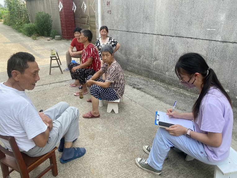 (图为志愿者调查家乡村民对村规民约的了解程度以及看法建议)