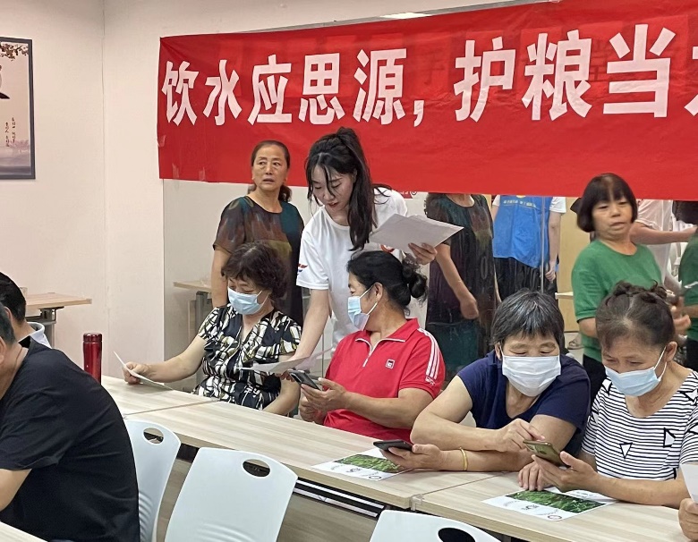 (图为志愿者向居民讲述爱粮护粮的重要性)