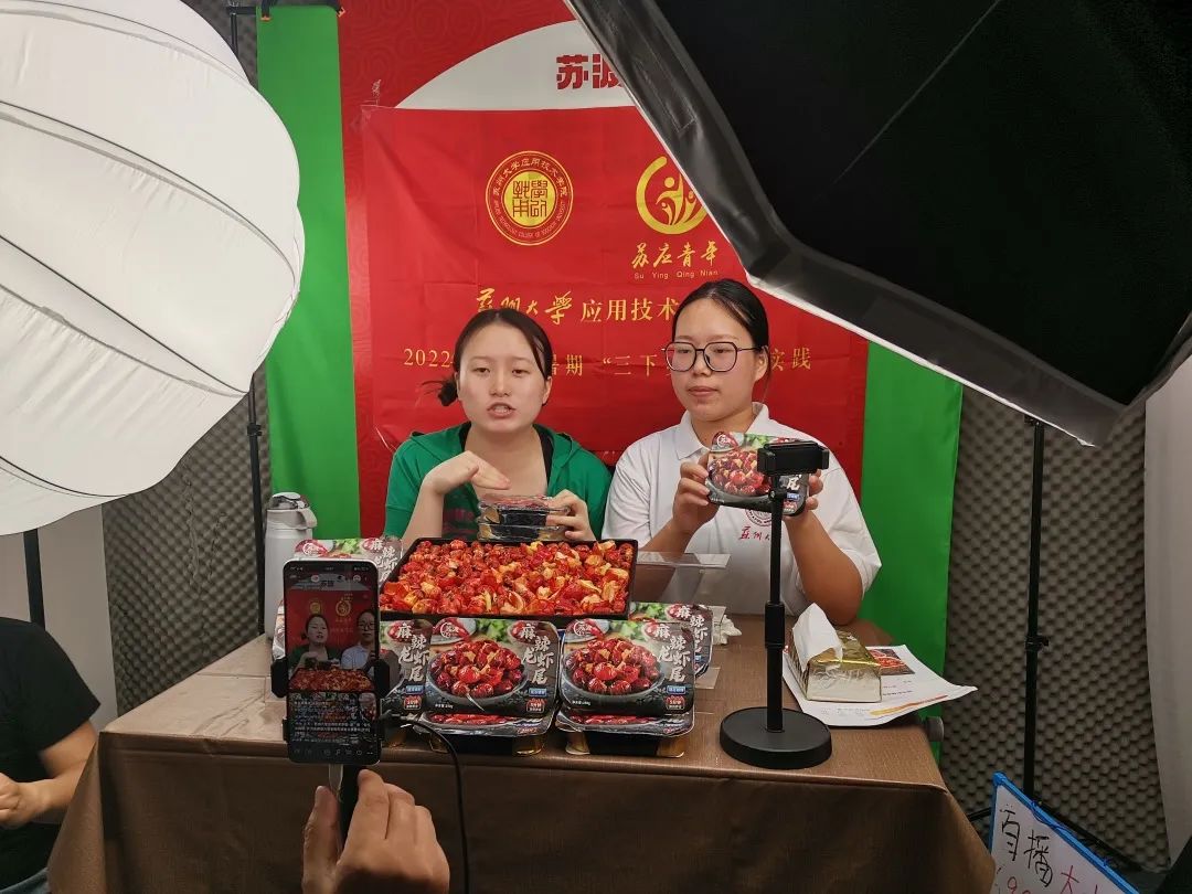 在壹只蟹大闸蟹(苏州)有限公司的直播基地,实践团成员以品牌助力官的身份来到苏波蟹业直播间同品牌主播一同完成1小时直播售卖。