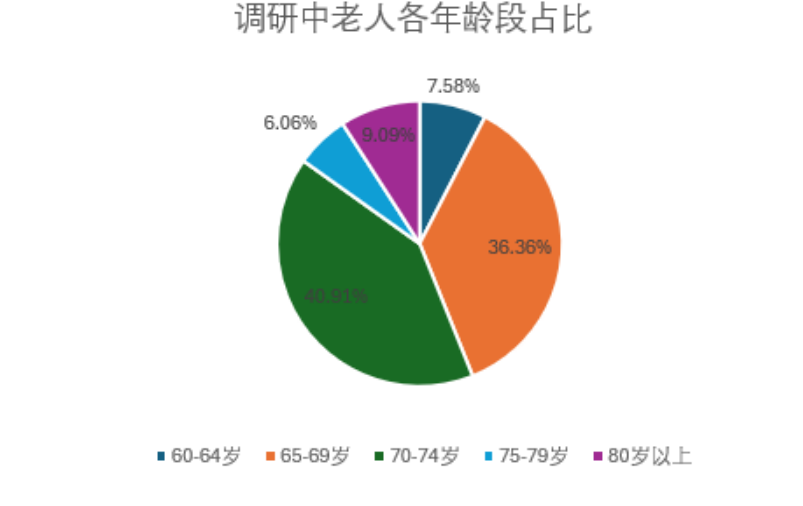 调研中各年龄段的分布情况:60-64岁占7.58%,65-69岁占36.36%,70-74岁占比最高,为40.91%,75-79岁占6.06%,80岁以上占9.09%。