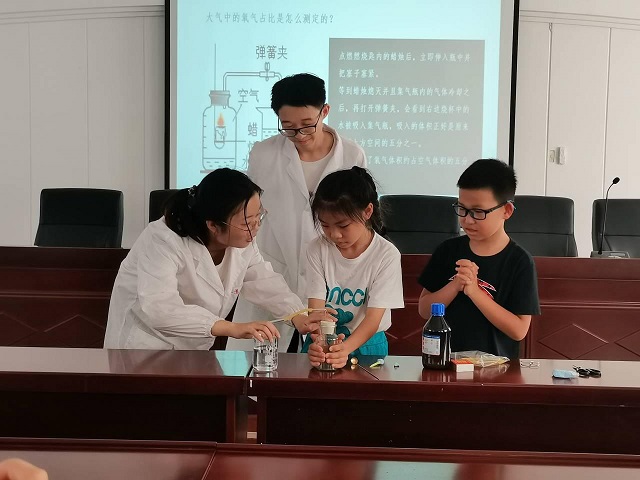 宣讲伊始,团队成员带领参与本次活动的孩子们做“空气中氧气含量测定”的小实验,实验原理为:蜡烛燃烧需要氧气,通过燃烧中氧气消耗造成的内外压强差将水压入瓶中,通过观察压入的水的体积占比从而近似估计出空气中氧气含量。通过对我们赖以生存的空气的分析实验及实践团成员对实验原理的讲解,孩子们对此次宣讲、对化学的兴趣被极大地激发。通过这个小实验,他们直观地认识到了空气中氧气的存在,认识到了大气对生命的重要性,同时也充分地感受到生活中的化学之美。在实验过程中,孩子们踊跃参与、认真学习,相信这次实验已然在他们心中埋下了小小的科学种子,厚植了科学研究素养。