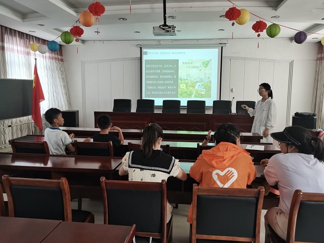 (图为团队成员向青少年宣讲低碳环保方面知识)