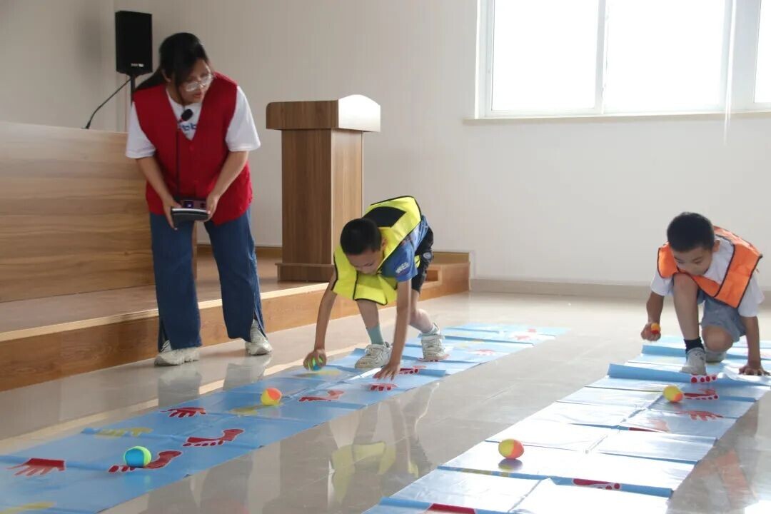 (志愿者带领小朋友开展手脚并用小游戏)