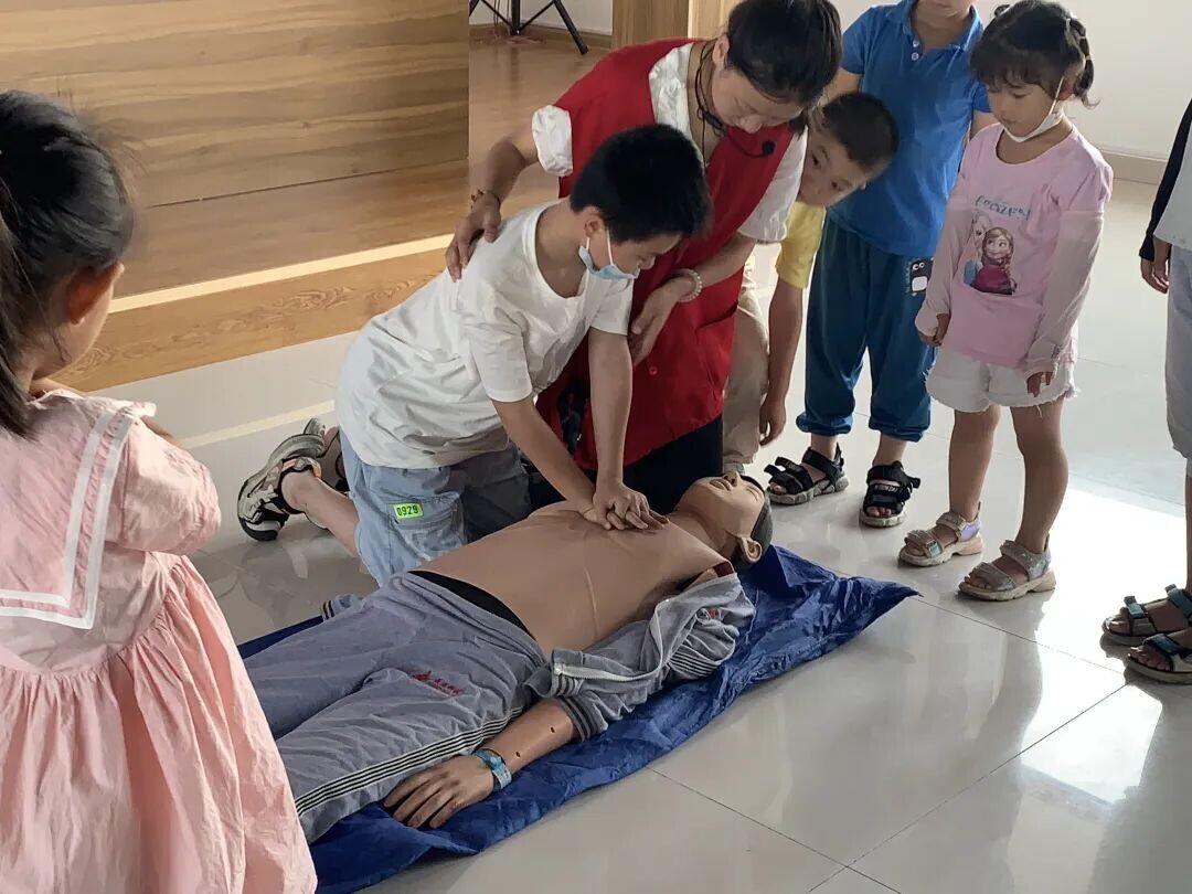 (志愿者带领小朋友实操CPR)