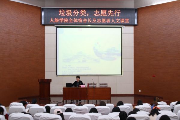 绿水青山就是金山银山。为贯彻习近平新时代中国特色社会主义思想中的生态文明理念为指引,秉承创新、协调、绿色、开放、共享的发展理念,同时为了进一步传承志愿服务精神,3月20日,苏州经贸职业技术学院人旅学院党总支陈寒副书记在图书馆二楼报告厅开展了“七彩志愿缅雷锋,环保建功新时代”——“垃圾分类,志愿先行”的人文课堂,我院全体宿舍长和志愿者参加。
