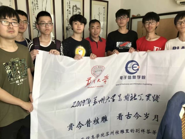 我们找人打听去了几家大师开的店,得知他们都出差了,幸运的是,在路人的指引下,我们有幸拜访到了核雕大师周雪官,周雪官大师的妻子得知我们的来意后十分热情的把我们领到了大师工作的地方,打开大师工作的房门,大师在那专心致志的雕刻核雕,我们有点不好意思打扰大师工作。大师似是察觉到有人到来,微微抬起头,我们赶紧上前进行了自我介绍,并说明了此次的来意,大师放下了手中的工具,向我们打了招呼,并且同意了我们的要求。当我们得知大师已经从事核雕这门技艺48年,我们每人的心中都很震惊,大家都不禁感叹大师的的确确是一位为核雕奉献一生的老艺术家,在采访过程中我们向大师提问做一个核雕大概多少时间时,大师说具体要看精细程度,一天工作8小时,有时一做就是好几个小时,当我们问起大师为何从事这个行业,大师说一开始只是为了学一门手艺,但是也没想到一做就是这么多年,大师在采访过程时提及,舟山村远离市区,人烟稀少,可以静下心来创作,顾客大多数是北方人。大师在采访时还特意强调不要炒作,听到这个要求,我们心中都敬佩不已,不禁感叹这真是一代大师。我们还借此良机向大师了解了核雕制作的相关注意事项和要求,让我们用亲手感受核雕。最后我们邀请大师与我们一起合影留念,本次的核雕村之行圆满结束。
