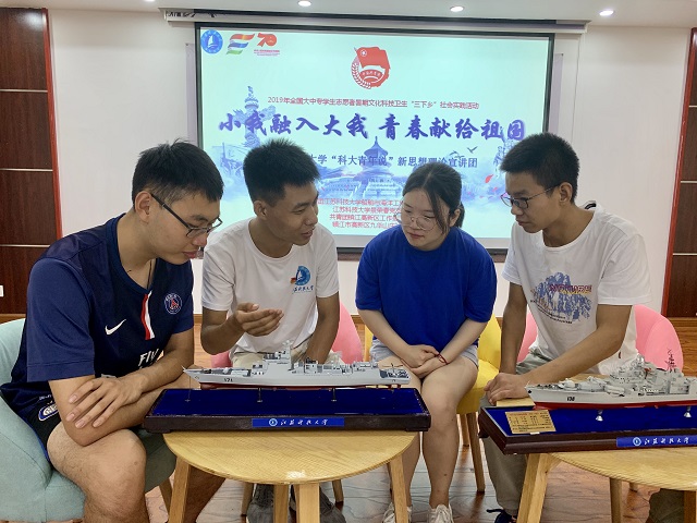 宣讲团带来的船舶模型也吸引了小朋友们的注意,宣讲部分结束后,小朋友们围绕在052C驱逐舰模型与集装箱船船舶模型周围。大学生宣讲员们带领小朋友们逐一认识着船舶的结构布局,讲述船舶制造发展与背景,引申出中华民族千年的“海洋梦”、新时代下建设“海洋命运共同体”理念。“去年,习总书记在参观青岛国家海洋实验室时曾经说过,‘建设海洋强国,我一直有这样一个信念’,我们江苏科技大学的时代使命就是建设海洋强国,建设海洋强国也是我们每一个江科大人的信念,其实这也应当是我们中华民族的一个信念。”宣讲员王翔峰表示,海洋强国正是每一个船舶与海洋工程专业学子的职责所在,也是他们的家国情怀所在。