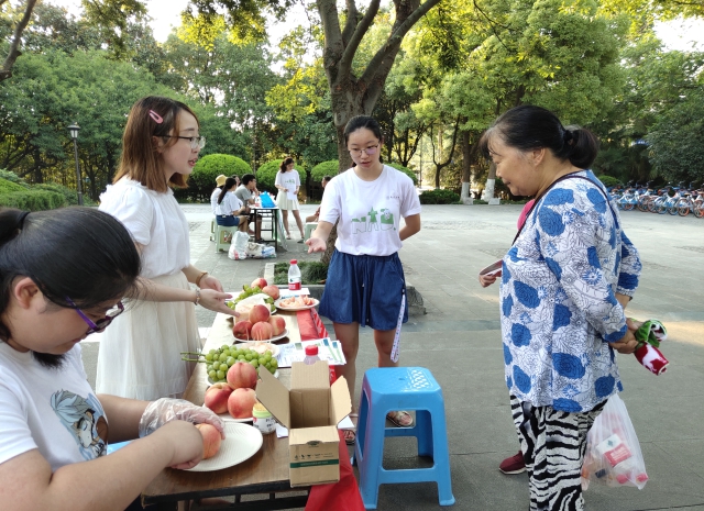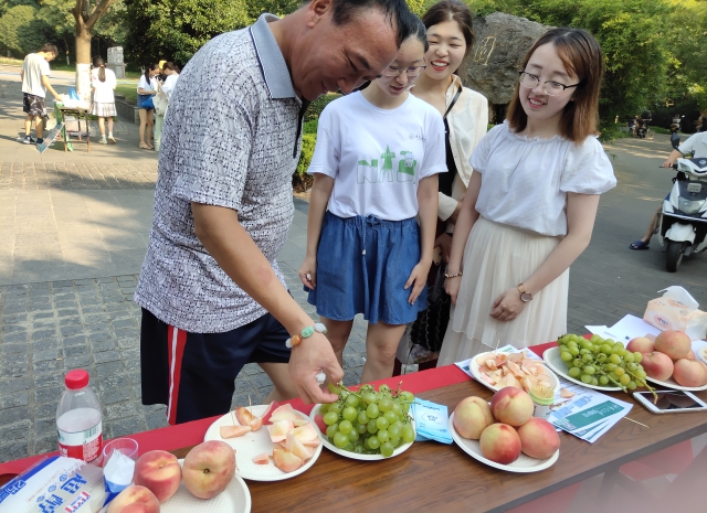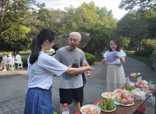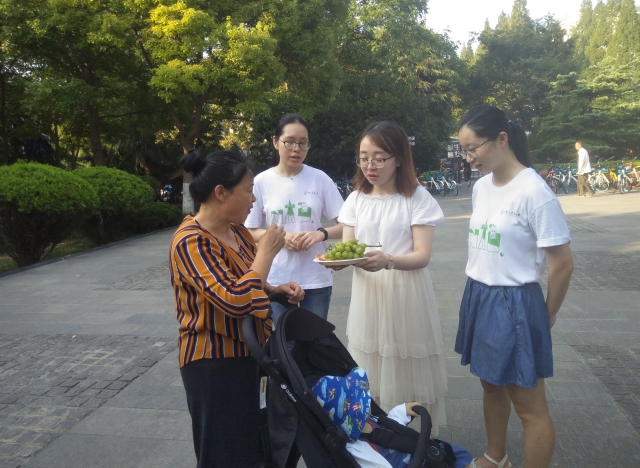 7月29日上午,植保院“生机农场佑食安”科普调研团队赴南京市下马坊遗址公园开展农产品品鉴会。本次活动以“品绿色食品,享有机魅力”为主题,团队成员邀请路人品尝有机产品和普通农产品,并对两者进行打分比较,活动中穿插科普讲解以及调查问卷的分发,实时实地进行有机农产品的质量调研。