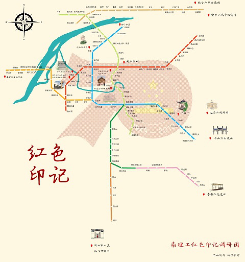 8月1日始,红色印记调研团成员开始制作南京市最新红色遗址地图,以南京市最新地铁线路为基准,查阅大量资料,标出南京市10条地铁线路附近的红色遗址地点,涉及玄武区、雨花台区、高淳区等11个市辖区,共找到15个代表性红色遗址地点,并设计出具体出行路线。