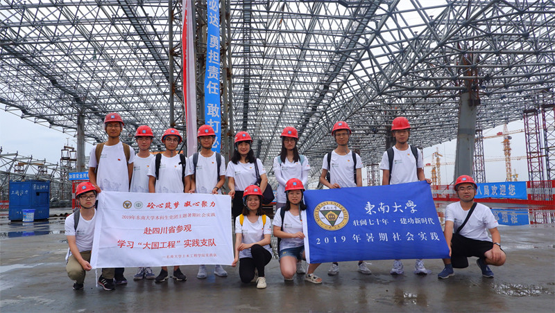 新中国成立70年来,特别是党的十八大以来,在以习近平同志为核心的党中央坚强领导下,伟大祖国西南片区发生了沧桑巨变,不断激发我辈青年的家国情怀,坚定同学们始终跟党走的理想追求,更激励着东南大学土木工程学院“砼心筑梦”实践队远赴四川,实地参观学习成都市及绵阳市国家重点工程和军工在建实验室项目,走访国有大型工程研究院、设计及施工单位,在实现中国梦的新长征中勇现土木人的使命担当,凸显东大土木人在祖国70载的伟大建设中勇于挑战、继往开来的工匠精神。