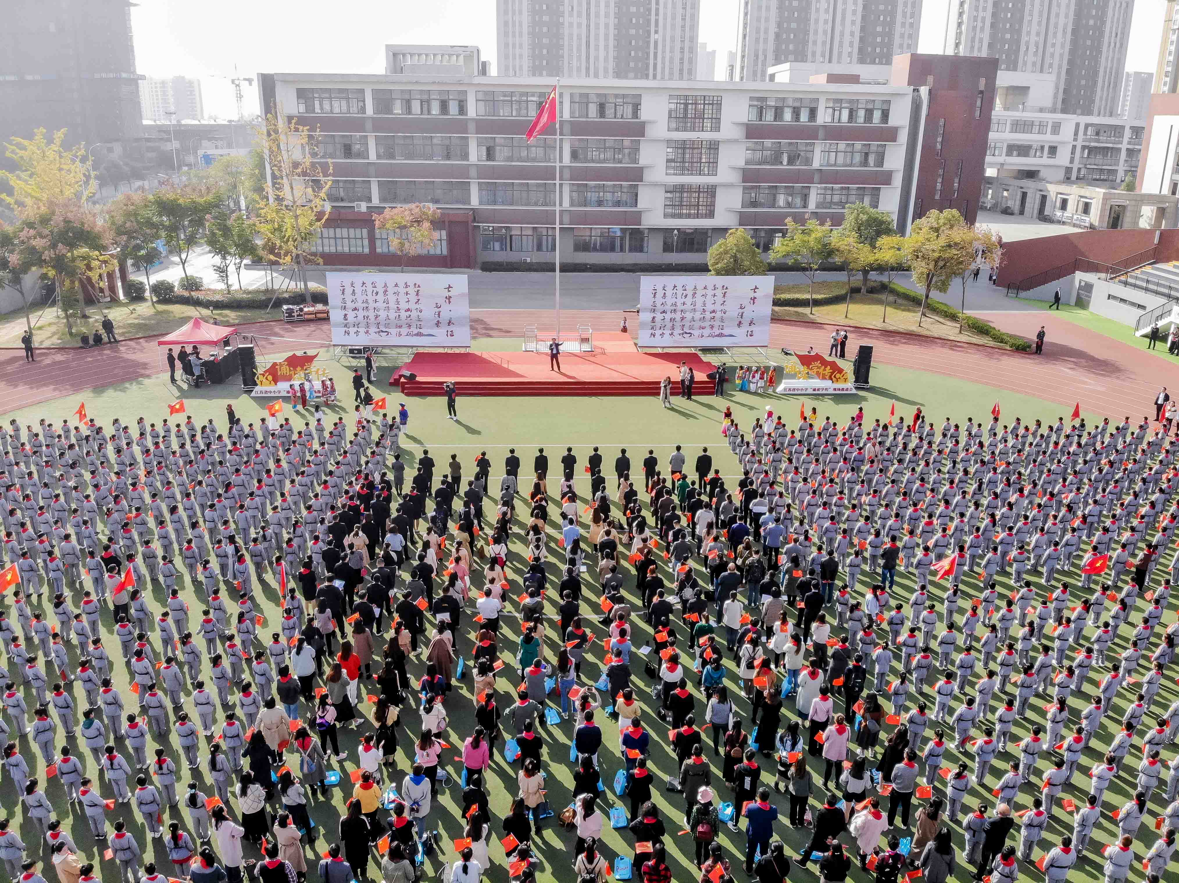 会前,参会代表体验式观摩了淮安周恩来红军小学“诵读学传”活动的开展情况和特色做法。代表们在“恩来园”与少先队员一同上了一堂以“励志爱国”为主题的微队课,在“文学园”观看了以“小书虫”社团经典诗文研读为代表的国学社团展示,在“长征园”与少先队员一起“重走”长征路,在“科学园”感受“红军娃寻访团”淮安高铁寻访活动中的喜悦和自豪。最后,在周恩来红军小学升旗仪式上,所有参会代表与少先队员齐诵《七律长征》,将整场气氛推入高潮。
