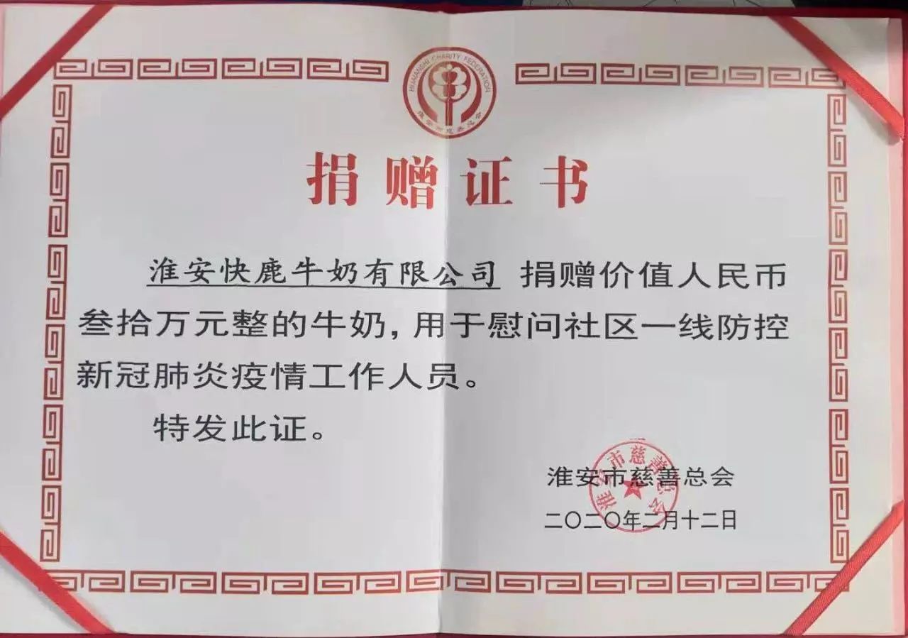 淮安快鹿牛奶有限公司向社区一线志愿者捐赠30万元牛奶