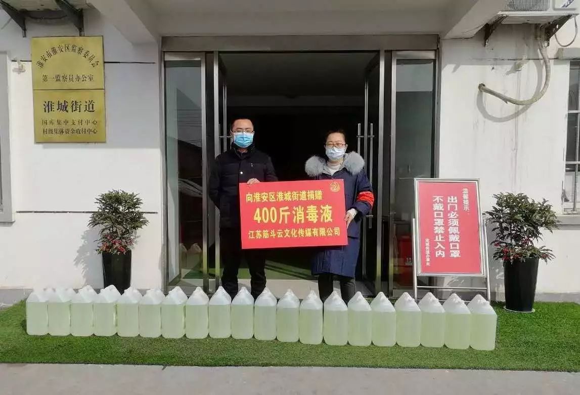 江苏筋斗云传媒有限公司向三个乡镇捐赠1200斤消毒液
