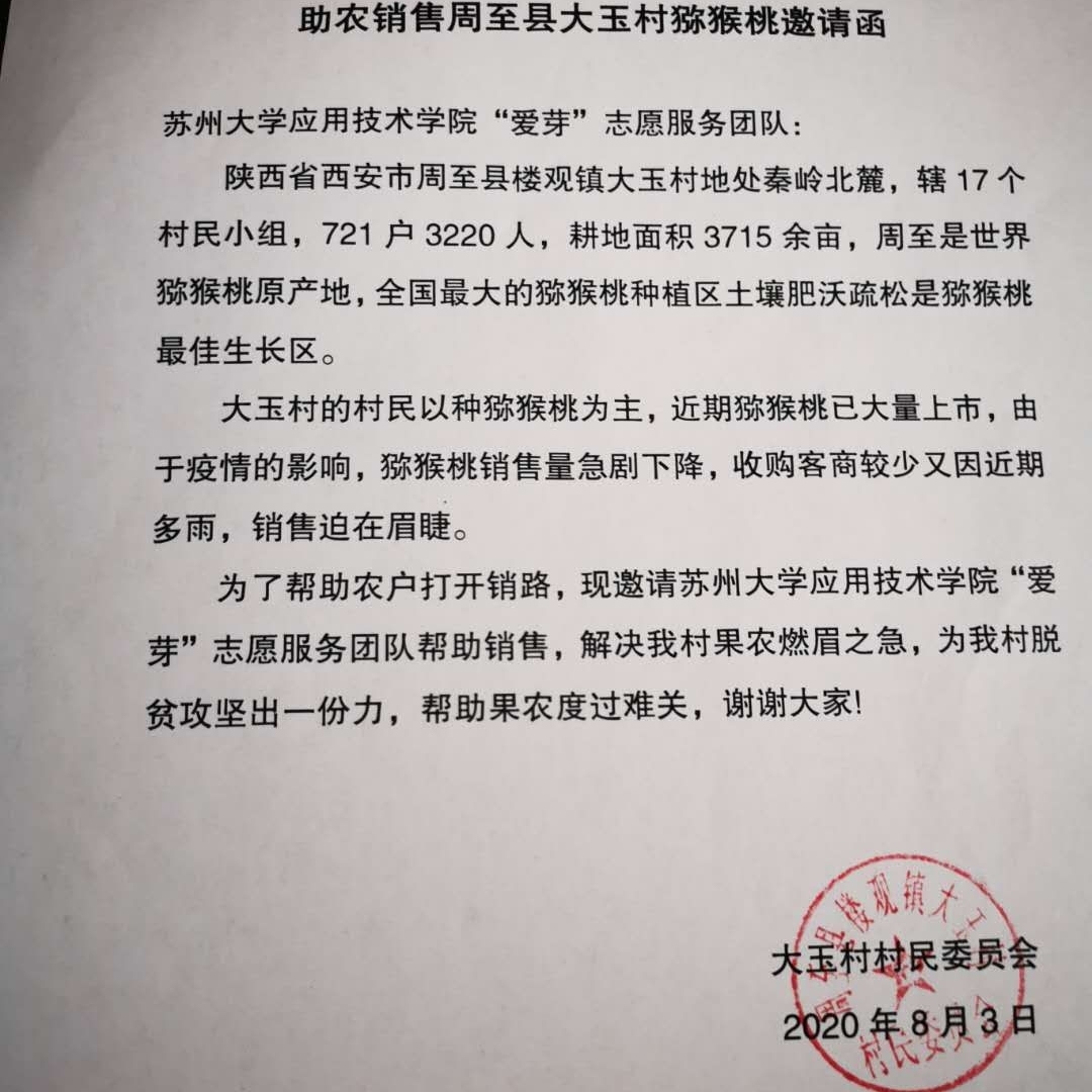 2020年是全面建成小康社会目标实现之年,也是全面打赢脱贫攻坚战收官之年,苏州大学应用技术学院“爱芽”志愿服务团队从消费扶贫、设计扶贫、志智双扶等多种途径提升周至果农造血能力,帮助大玉村721户农户、3220人解决疫情防控形势下、恶劣天气造成洪涝灾害下的果品滞销问题,积极探索产业发展新模式,走出一条适合周至果农脱贫致富的新路子。