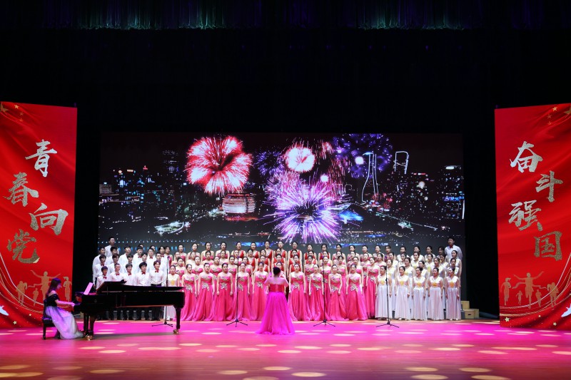 奋斗百年路,激昂理想之光。金色镰刀收割明媚,铮铮铁锤唤醒心扉,经管学院《唱支山歌给党听》用优美的旋律、深情的声音拉开合唱序幕;音乐学院《四渡赤水出奇兵》描绘红军战士过雪山,涉草地的艰难,歌颂红军的钢铁意志;拳拳爱国心,切切报国情,美术学院《英雄赞歌》诉说时代巍峨;文学院歌声嘹亮颂峥嵘岁月,《万里长城永不倒》鼓点铿锵咏大好河山;在磨砺中成长,在烈火中腾飞,城环学院《前进吧,中国共产党》致敬伟大旗帜,筑牢信仰丰碑;革命红旗迎风飘扬,中华儿女奋发图强,法政学院用《我们走在大路上》唱响对党的祝福;五四的荣光属于奋斗的青年,化院一首《祖国不会忘记》雄壮有力,刚健豪迈;在劈波斩浪中开拓前行,在攻坚克难里走向辉煌,物电学院《歌唱祖国》热情激昂,自信慷慨;数统学院《保卫黄河》气势如虹,振奋人心,绘就一幅中华儿女为国而战的恢弘长卷。