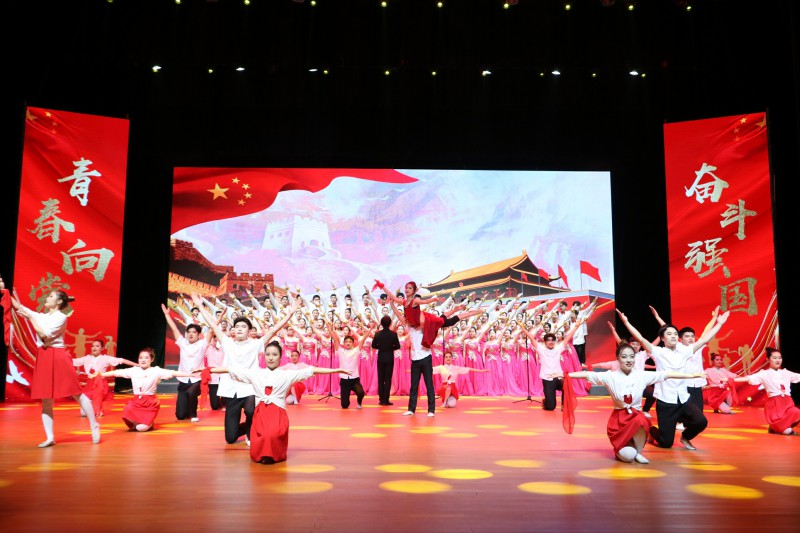 “没有共产党就没有新中国,共产党辛劳为民族,共产党他一心救中国,他指给了人民解放的道路,他领导中国走向光明……”音乐学院带领全场观众齐唱《没有共产党就没有新中国》,朴实的歌词,滚烫的旋律,表达淮师青年坚定跟党走的信念,如旗帜,似号角,激励着淮师青年追随在中国共产党的旗帜下奋勇前进。