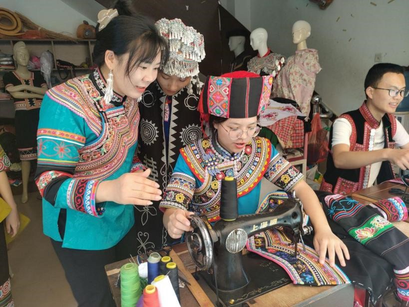 图为实践队员在彝族手工刺绣坊学习使用缝纫机