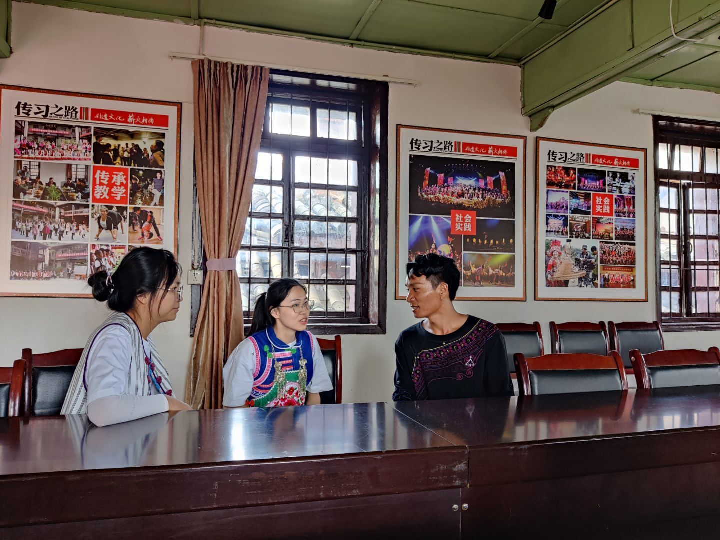 团队成员走进石屏县龙朋镇李怀秀李怀福非遗传习所进一步了解非遗文化。李怀秀李怀福非物质文化遗产传习所成立于2011年,是以保护传承、宣传展示云南非物质文化遗产,辅导培训年轻传承人为主的公益性群众组织,2016年被评为云南省级非物质文化遗产保护传承基地,并通过民政注册为群众性团体。当队员们走进传习所的时候,正巧碰上李怀秀李怀福非遗传承班开班仪式。通过了解,很多初中小学甚至幼儿园的孩子每年暑假都会在这里报名学习烟盒舞和海菜腔等系列非遗文化。