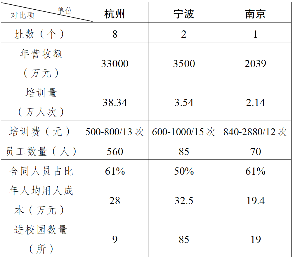 对比杭州青少年活动中心、宁波市青少年宫,南京市青少年宫的年营收额、培训量、人员数量等方面都有明显的差距,具体如下: